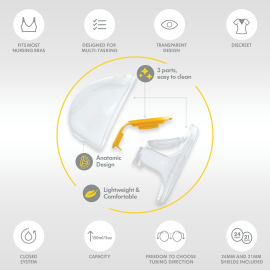 • Läbipaistev disain: võimaldab kergesti kontrollida, et rinnanibu oleks õigesti tunnelisse asetatud, vältides hõõrdumist ja toetades tõhusat piima väljalüpsmist. Läbipaistvad kausid aitavad jälgida piima voolu ja mõõta mahtu pumpamise lõpus.