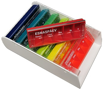 Nädala ravimijaotuskarpide komplekt esmaspäevast pühapäevani. Ravimijaotuskarbid on markeeritud lahtritega hommik, lõuna, õhtu, öö ja vajadus. Masinpestav 30 kraadi juures.
