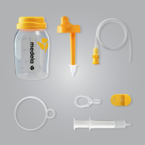 Komplektis: 150 ml piimapudel ja kaas, TwistLok kaas, TwistLok voolik, ümar rõngas-hoidik pudelile, klamber, vooliku sulgur, süstal.